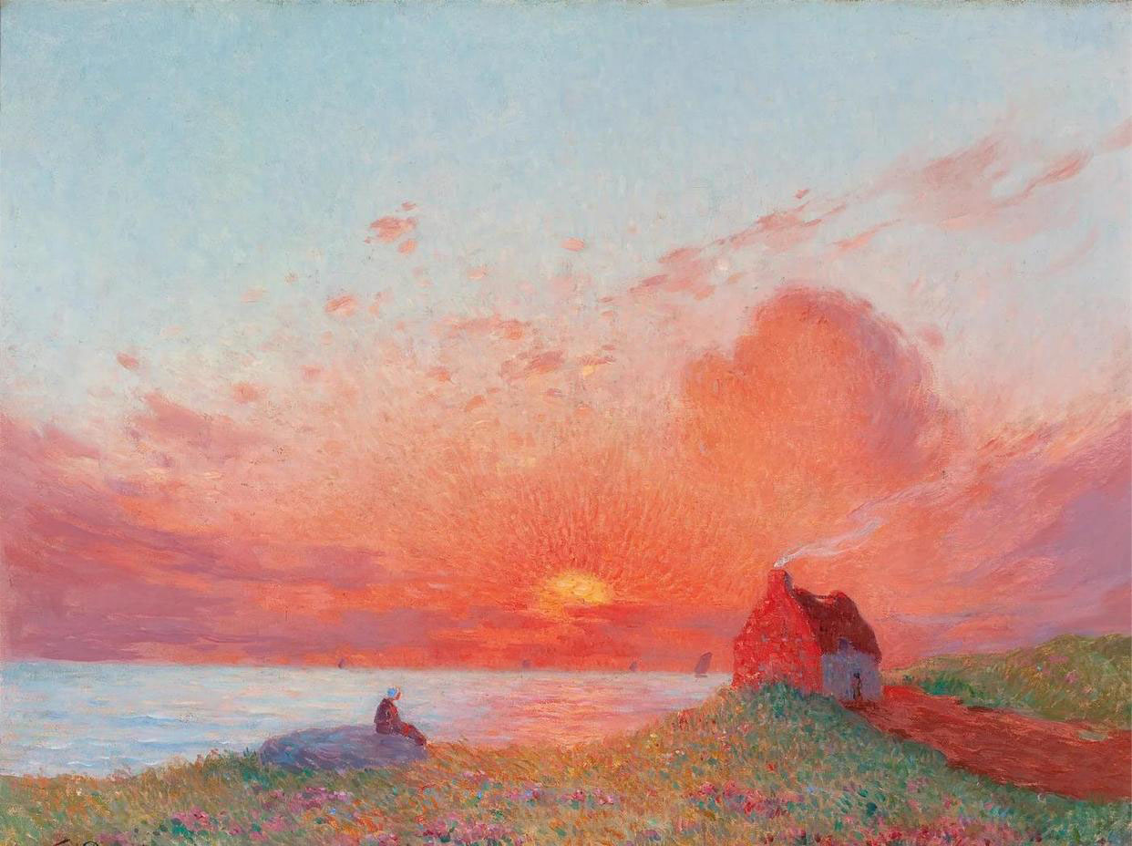 图1 《克鲁瓦附近的日落》费迪南德・杜普伊加多 约1930 就像他的作品《克鲁瓦附近的日落》,他痴迷于捕捉这样的瞬间 —— 夕阳将云霞燃成橘红,海面漾着金辉,小屋的炊烟与草甸的繁花在画面中共生。你看画中那静坐在岸边的身影,仿佛也和他一样,沉醉在天地间的温柔之中。 他的一生,都在追着这样的 “瞬间美好” 作画,期盼着自己的画能将自然的诗意,轻轻送到人们心里。中国古诗里有句 “余霞散成绮,澄江静如练”,看向这幅画里漫天云霞如彩绸舒展、海面像白练般静美的景象便会发现:原来不管是法国的海岸,还是东方的江天,自然绘就的浪漫,总能让人心动。 |